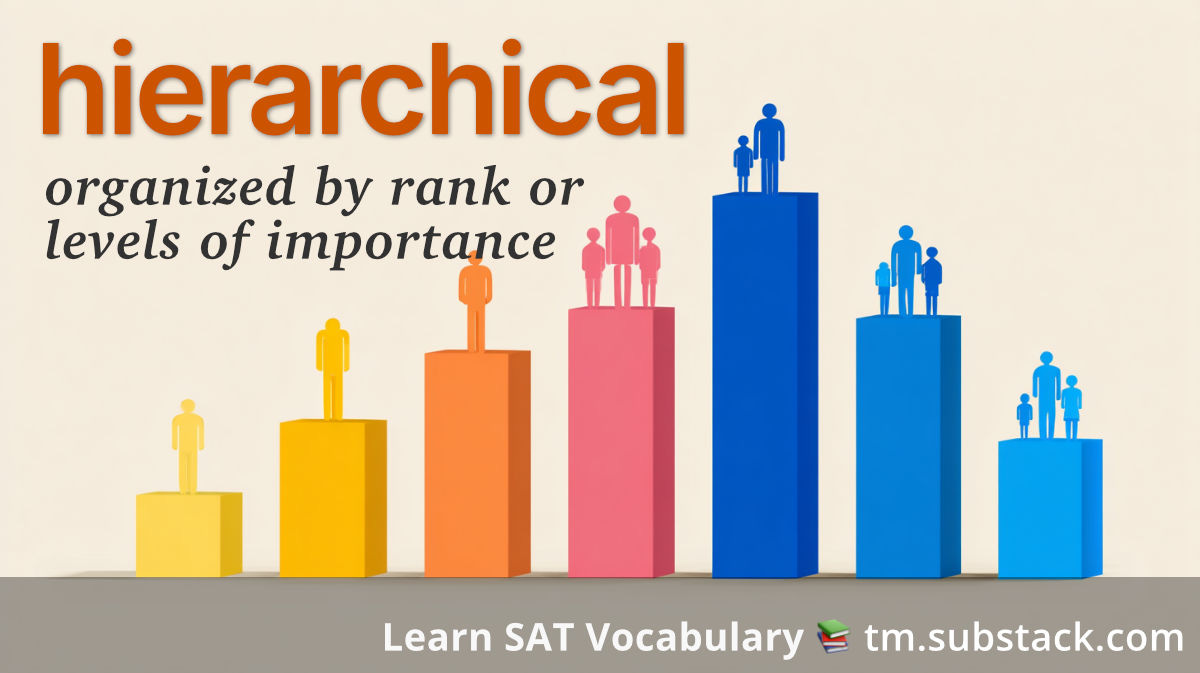 Hierarchical (adjective): Organized or classified according to rank, authority, or levels of importance, with each level subordinate to the one above it. Example: a hierarchical corporate structure for employees.