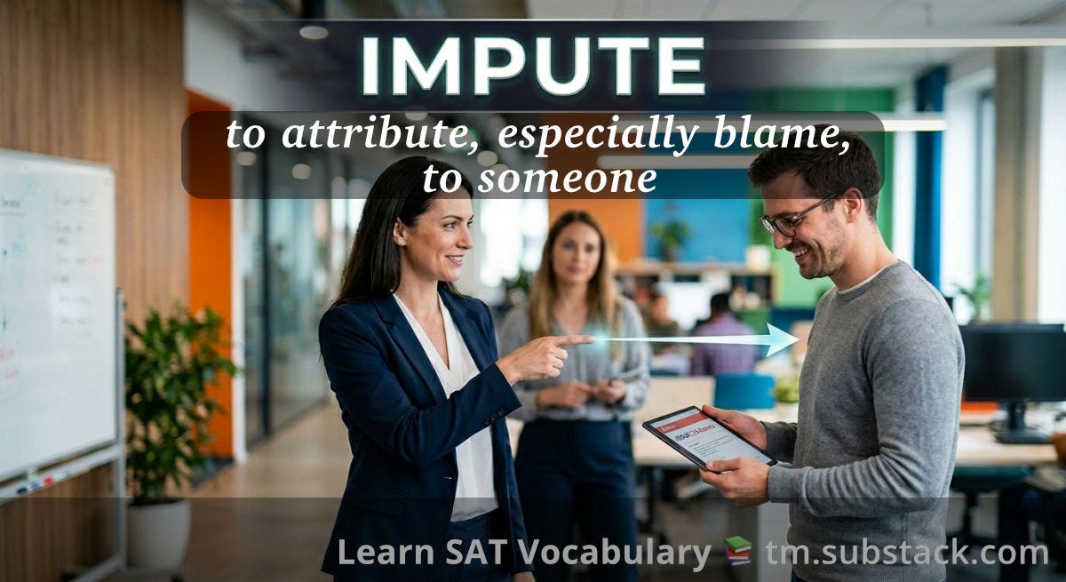 Impute (verb): To attribute or credit something (often a fault, blame, or quality) to a person or cause, sometimes without full proof. Example: to impute bad motives.