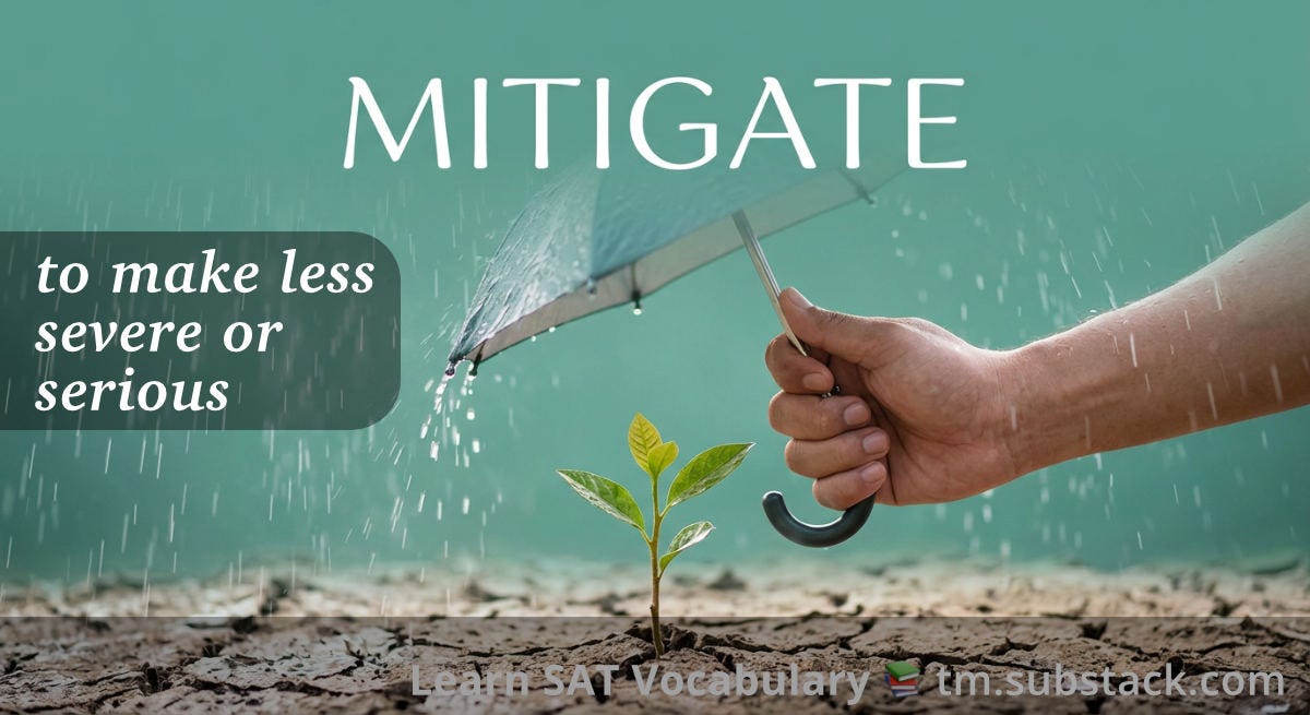 SAT relevance: Mitigate is a top-tier SAT word that frequently appears in reading passages about science, policy, and history. It also shows up in vocabulary-in-context questions, where students must recognize its near-synonyms like alleviate or ameliorate, or distinguish it from its opposites like exacerbate.