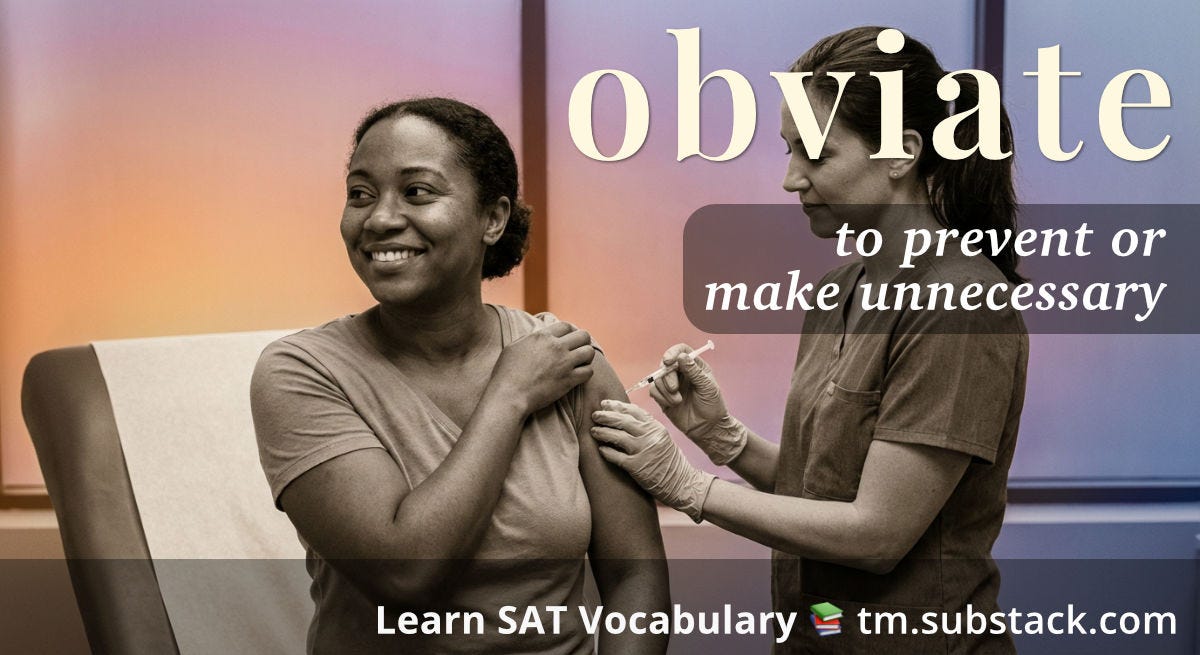 SAT relevance: Obviate is a relatively high-frequency word in academic and professional writing. It could appear in reading passages about science, policy, or history, or as a vocabulary-in-context question.