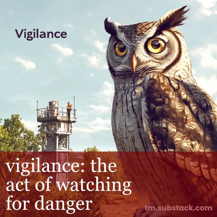 vigilance means the action or state of keeping careful watch for possible danger or difficulties. Example: constant vigilance is required.